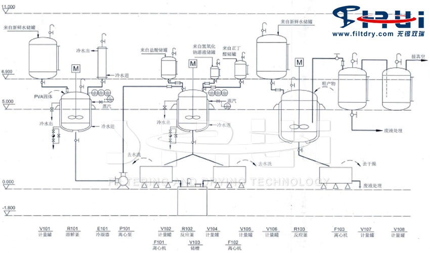 原有年产2000吨PVB树脂合成车间生产工艺如图所示,将PVA在溶解釜R101中加水升温溶解后,用泵P101输送至缩合釜R102,缩合、中和反应在同一只釜R102中完成,由离心机F101、F102过滤后的粗滤饼,经操作工用推车送至洗涤釜R103中洗涤,通真空抽干再加去离子水洗涤,然后抽干,按此重复进行,共洗涤八次,zui后一次洗涤后,直接让固液混合物从出料口流出至离心机F103中离心过滤,再送至干燥车间,得到PVB产品。