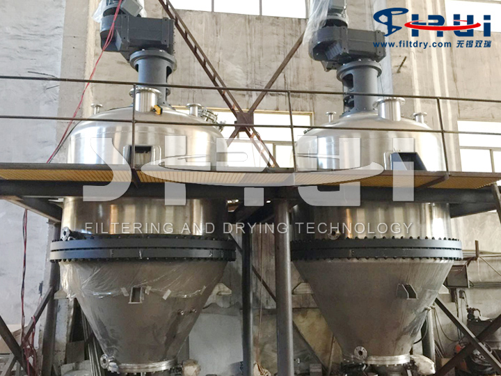 (2) 筒锥式过滤洗涤二合一水洗釜的洗涤液出口设置在锥体底部。当水位下至釜底时,打开减压阀门,将釜内的水份全部抽离,加快水洗效率,提高产品品质。